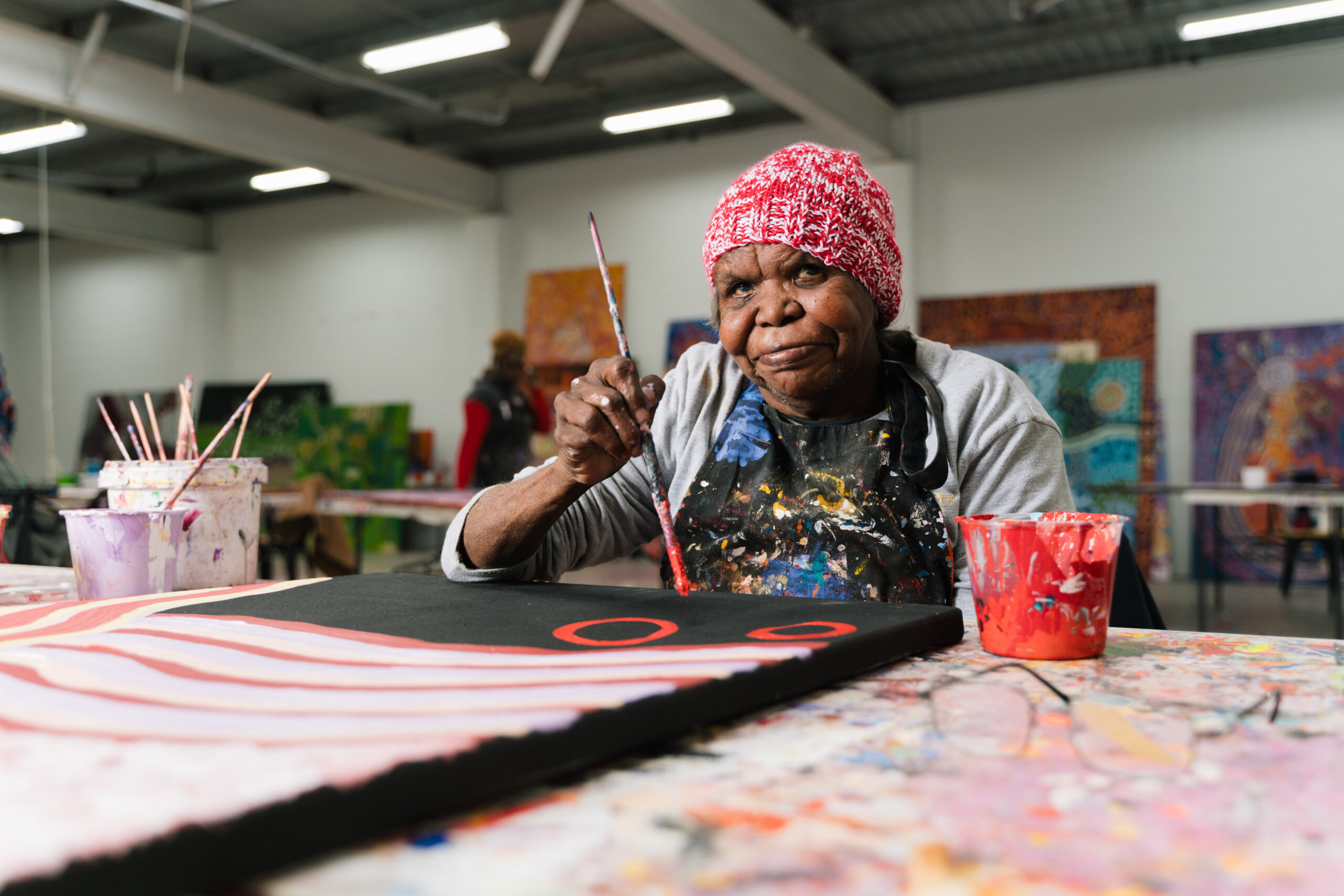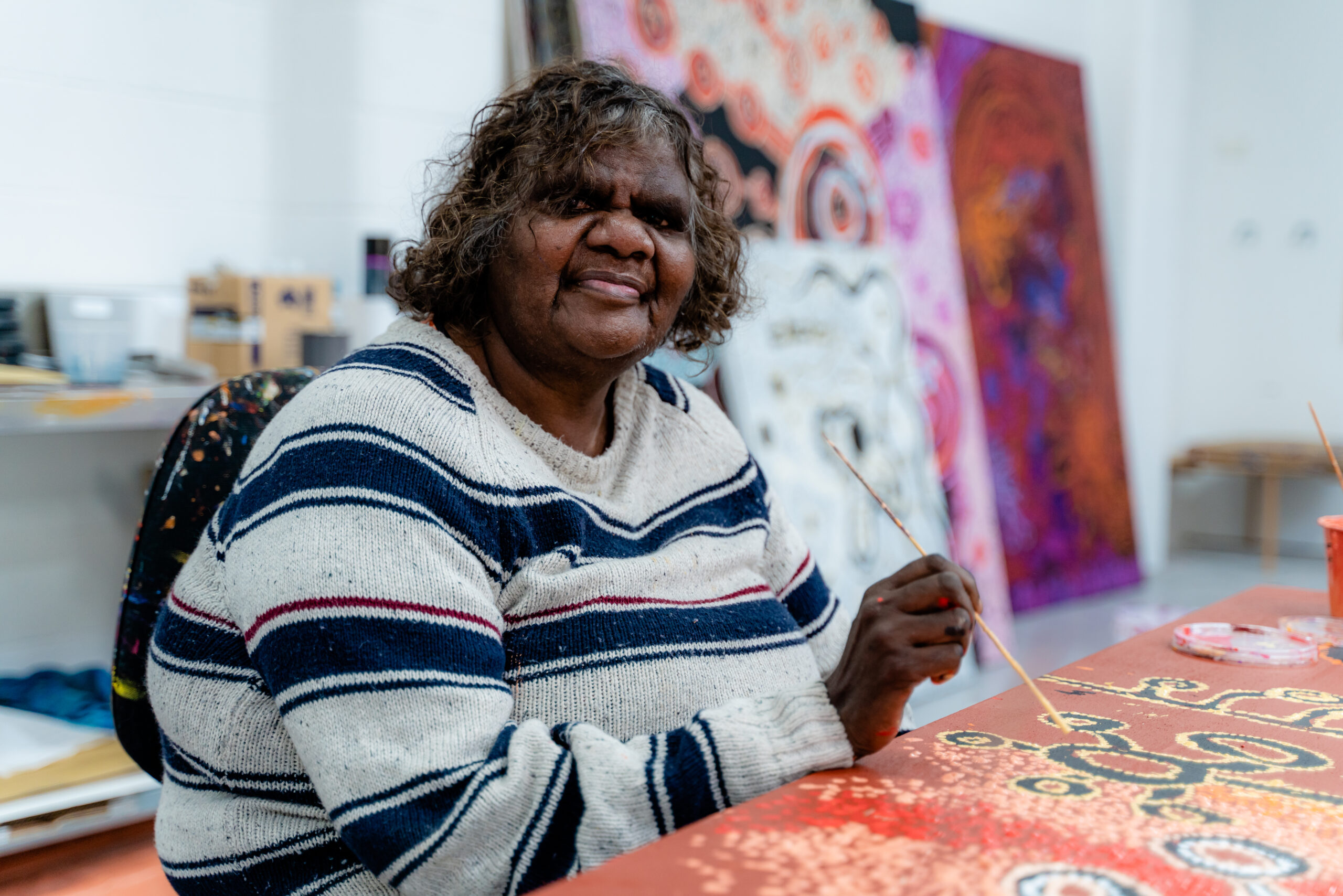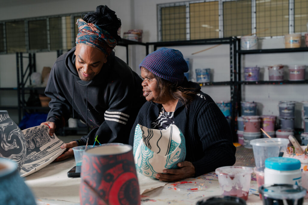 Collective Art Centre supports Anangu artists visiting Adelaide for health and family reasons and supports Anangu who are permanently based in Adelaide; required to live ‘off-Country’ to receive long-term medical or social support. For artists, living or spending time away from home means a loss of social, cultural, and economic opportunities usually provided by their local art centre. Working to curb these challenges, Collective Art Centre provides essential support to artists, enabling them to maintain vital cultural and community connections and income stability, alongside culturally appropriate support to access healthcare and other services.